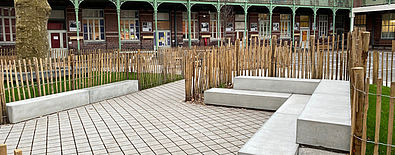 Les cours nouvellement végétalisées ont été également repensées en termes d’usage et d’imaginaire pour créer un environnement favorable au développement psychomoteur des élèves, et ont été aménagées de manière à lutter contre les effets du réchauffement climatique, les inégalités et la baisse de la biodiversité.