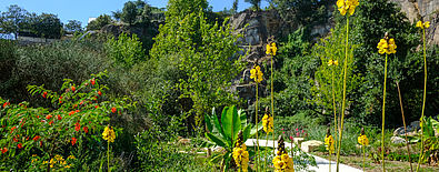 Une cascade de 25 mètres révèle le front de taille de la falaise, tandis qu’une palette végétale d’une richesse incroyable (fougères arborescentes, bananiers, mais également arbres et plantes plus tempérées choisies dans des pépinières de la région...) procure une impression d’opulence et génère une ambiance exotique adaptée au microclimat préexistant sur site.